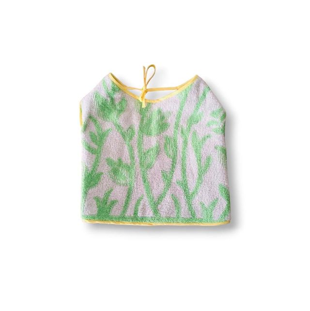 Le tissu éponge utilisé pour ce bavoir est de seconde-main ; vous ne savez donc pas choisir un tissu éponge précis mais bien une gamme de tons.