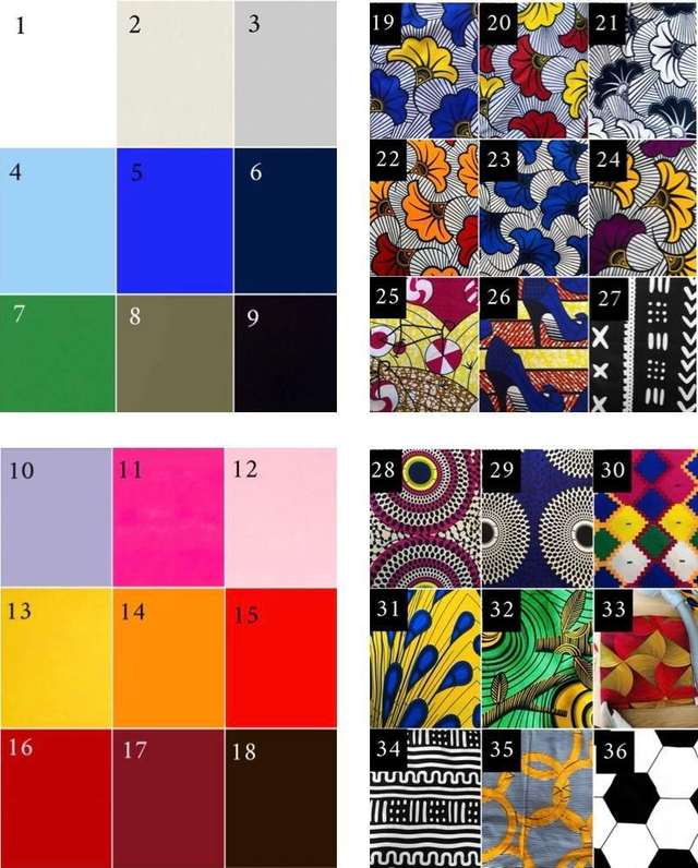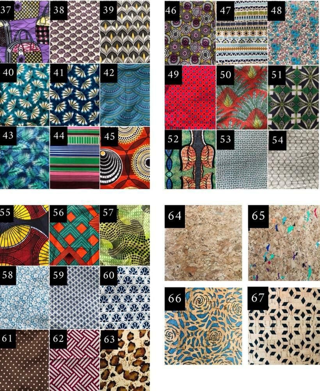 Découvrez les nombreux tissus disponibles pour décorer vos boutons. Les n⁰ 64 à 67 sont du liège.