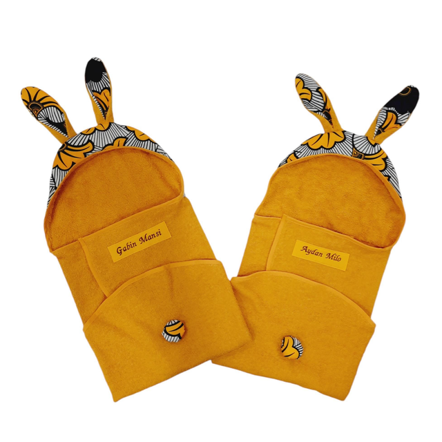Lors de votre commande, indiquez dans l'onglet "message au vendeur", le texte à broder sur la serviette (et éventuellement la couleur dans laquelle ce texte doit être), votre numéro de choix de tissu (pour la capuche, les oreilles et la queue) ainsi que la couleur du tissu éponge (cfr illustration avec lettres A à I).