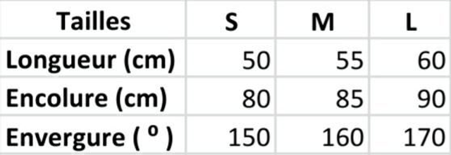 Elle est disponible dans plusieurs coloris et tailles ; référez-vous au tableau des dimensions en illustration pour choisir au mieux votre taille.