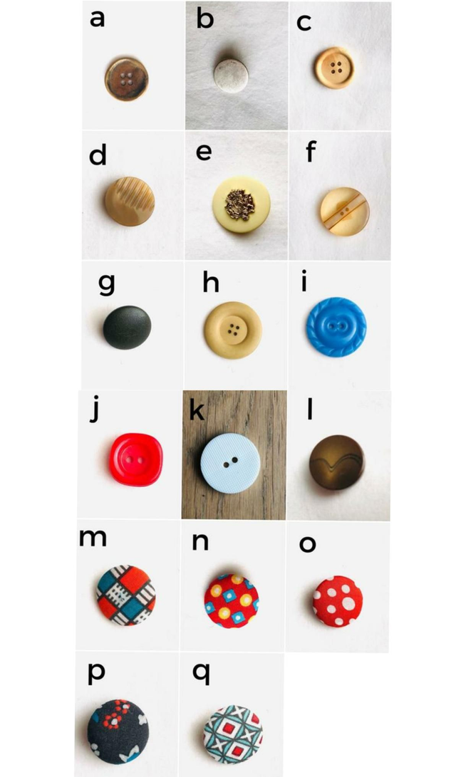_ les boutons souhaités : simplement une couleur ou bien un modèle précis (lettres a à q) ou encore des boutons recouverts d'un tissu Síroé.