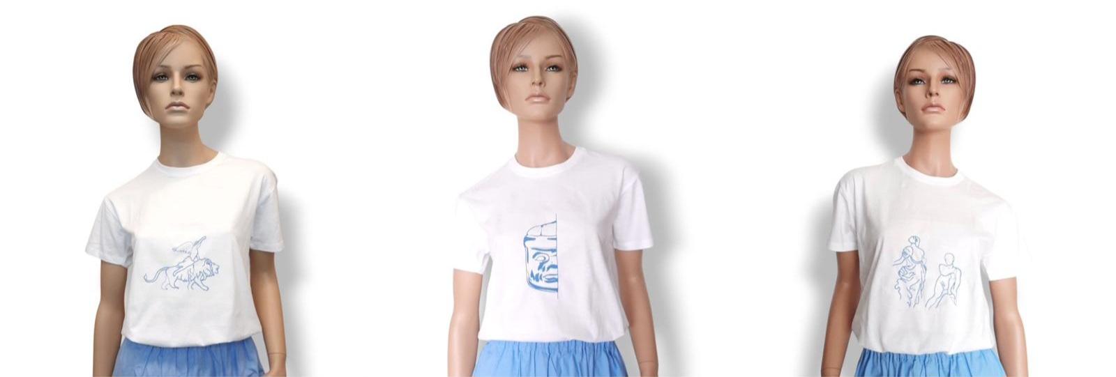 Lisa a également souhaité rendre accessible ses jolis dessins via différents medium . “𝑯𝒆𝒓𝒄𝒖𝒍𝒆“, “𝑶𝒍𝒎𝒆̀𝒒𝒖𝒆“ 𝒆𝒕 “𝑳𝒊𝒐𝒏“ sont « trois modèles, trois histoires nées de simples croquis » inspirés de notre formation commune en histoire de l’art et archéologie. Ils sont comme « un dialogue entre la main, la matière et le temps ». Lisa et moi avons travaillé ensemble à conserver le plus possible, dans la broderie, l’aspect schématique et furtif du croquis. « Chaque trait, chaque fil raconte un peu de ce moment suspendu où l’idée devient matière. »